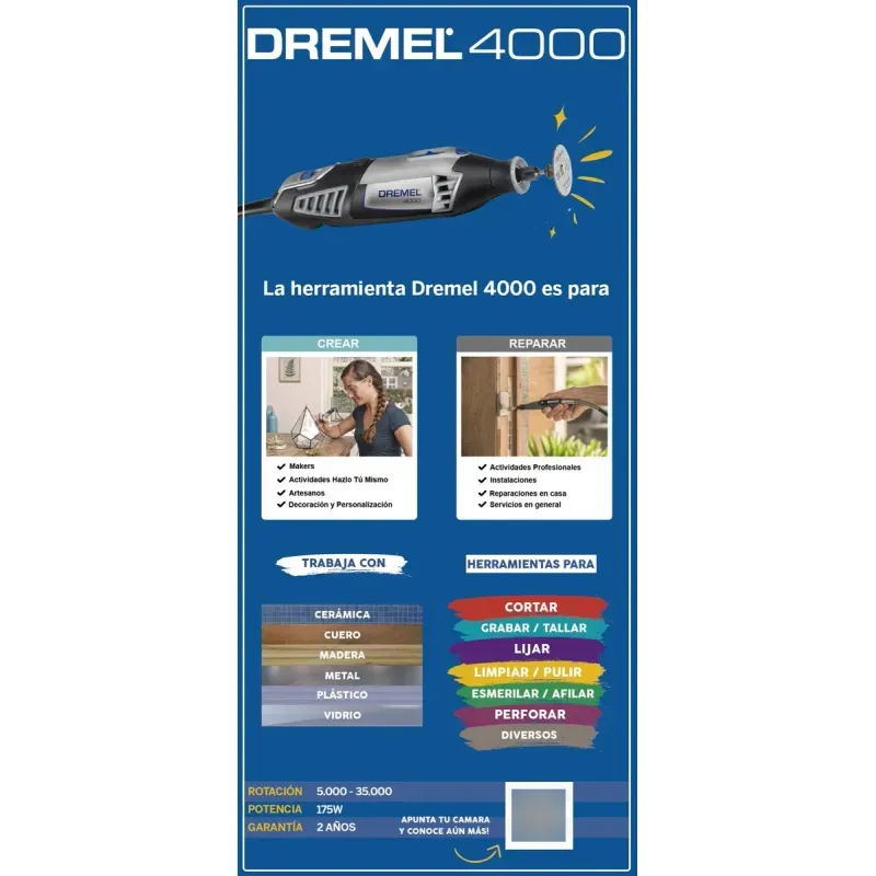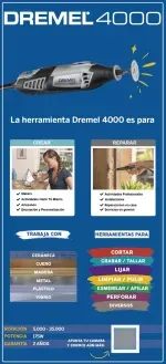 Dremel 4000, fuerza, precisión y multifunción en solo una herramienta.Cuerpo engomado y ergonómico para mayor confort durante las aplicaciones.