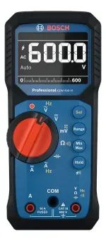 Multímetro digital profesional Bosch GDM 600-15 True RMS ideal para técnicos y electricistas que buscan precisión y durabilidad. Gracias a su tecnología True RMS, brinda mediciones exactas de voltaje, corriente, resistencia, frecuencia y continuidad incluso en señales distorsionadas, garantizando resultados confiables en cada diagnóstico. Su diseño compacto y ergonómico con pantalla LCD invertida facilita el uso con una sola mano y la lectura en cualquier condición de luz. Cuenta con clasificación IP65, lo que lo hace resistente al polvo y al agua para entornos exigentes. Perfecto para trabajos eléctricos, mantenimiento e instalaciones profesionales.
